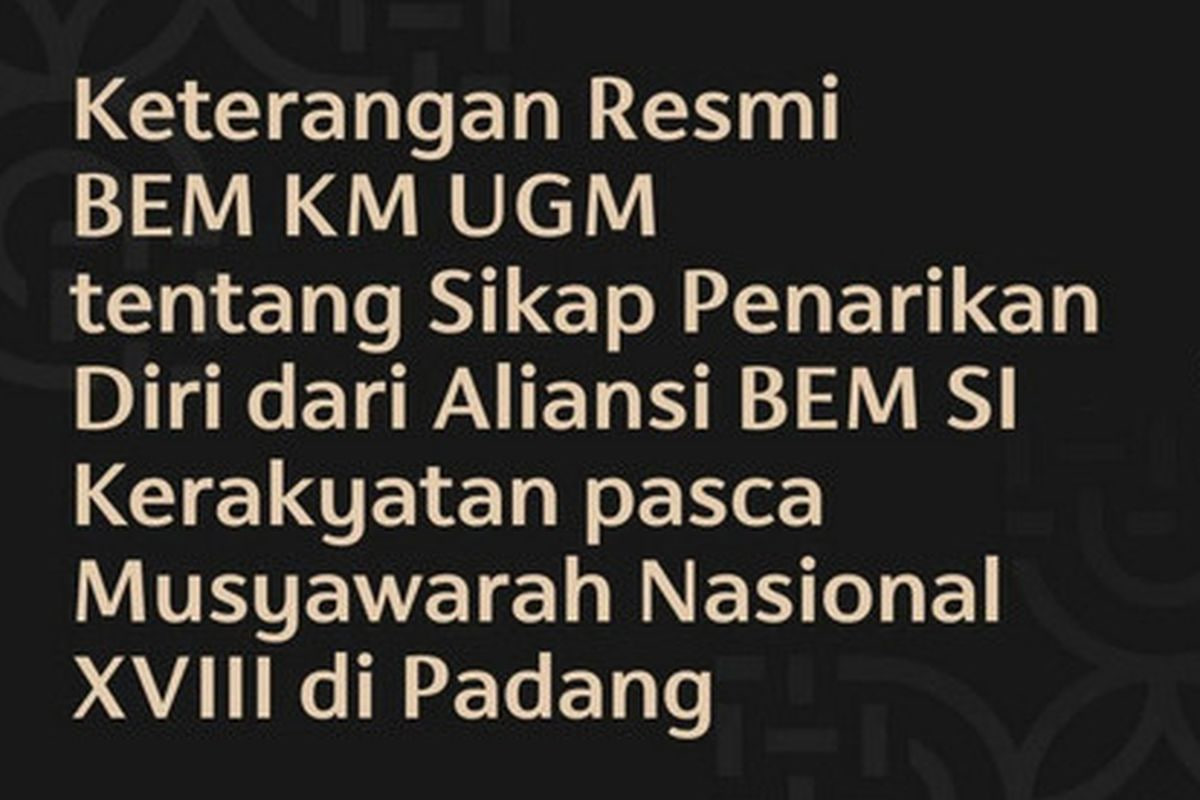 BeritaYogya.com – Badan Eksekutif Mahasiswa Keluarga Mahasiswa Universitas Gadjah Mada (BEM KM UGM) secara resmi menyatakan mengundurkan diri dari keanggotaan Aliansi BEM Seluruh Indonesia (SI) Kerakyatan. Keputusan ini diambil menyusul pelaksanaan Musyawarah Nasional (Munas) ke-XVIII BEM SI di Padang, Sumatera Barat, yang dinilai telah menyimpang dari prinsip independensi gerakan mahasiswa.
